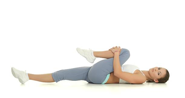 Lie on your back, bend your knees, and cross your right ankle over your left thigh. Pull your left leg toward your chest, keeping both feet flexed.